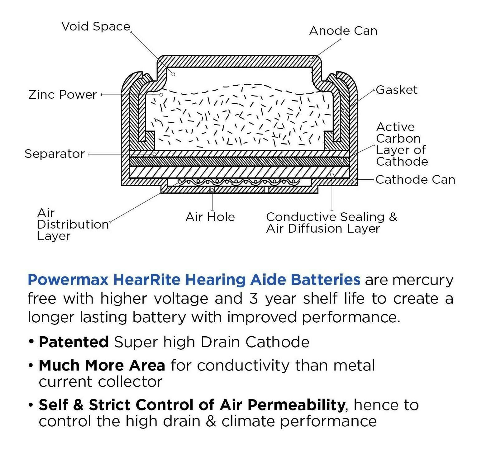 You need reliable and long-lasting power for your hearing aids, and you can count on the superior quality of the Powermax zinc air premium hearing aid battery. Zinc air Technology creates a higher energy density allowing for quick power and longer shelf life. Our brown tab size 312 hearing aid batteries are mercury-free and have easy change tabs allowing for quick use.