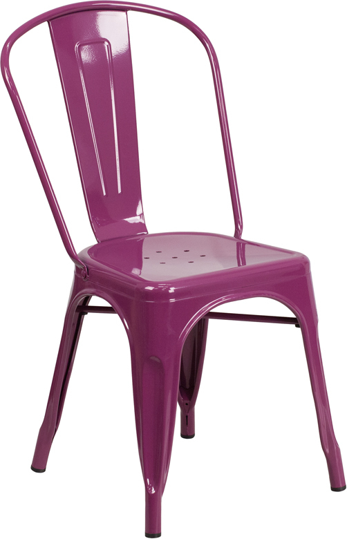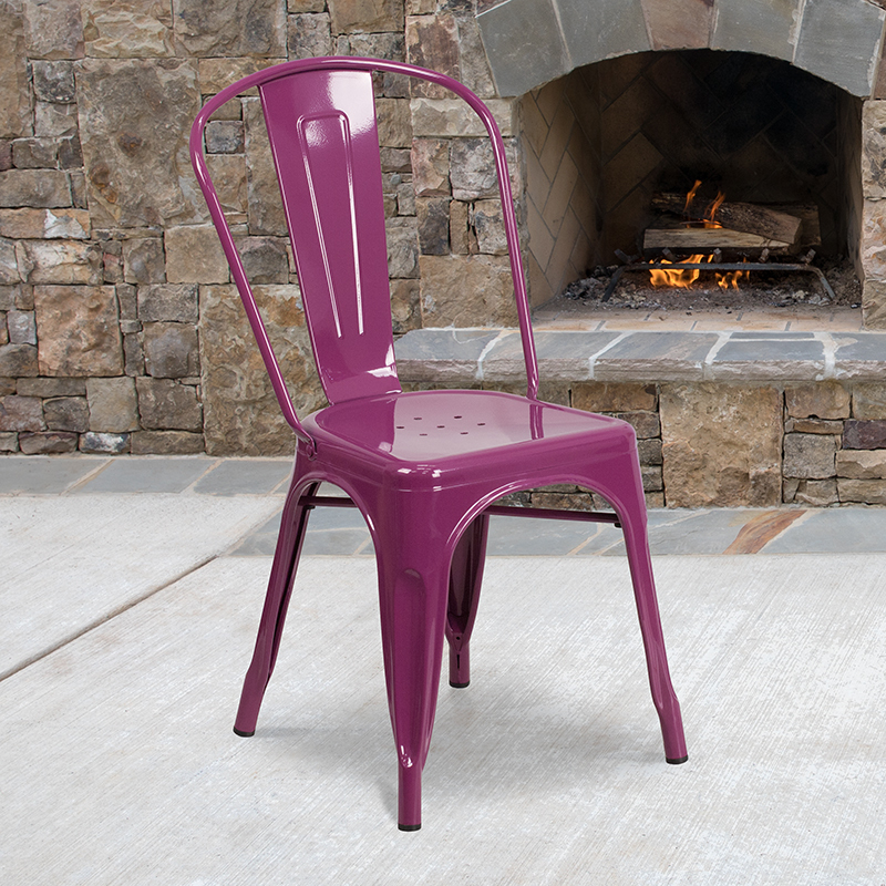 When you want create an inviting, attractive and stylish dining room either at home or in your restaurant look to these colorful metal chairs. Eclectic combinations of metal dining chairs and traditional, vintage or modern dining tables is on trend and extremely fashionable . The versatility of this chair allows it to easily conform in different environments and adding colorful chairs can rev up any setting. Chairs are lightweight and easily stack for storing. A cross brace underneath the seat adds extra stability and features protective caps that prevent the finish from scratching when stacked. The frame is designed for all-weather use making it a great option for indoor and outdoor settings. For longevity, care should be taken to protect from long periods of wet weather. The legs have protective floor glides that prevent damage to flooring. No matter where you use it, this colorful metal chair will be the envy of the neighborhood. [ET-3534-PUR-GG] Dimensions: 17.75"W x 20"D x 33.5"H