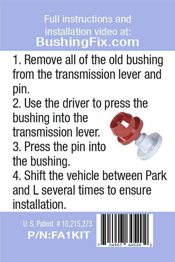 This FA1KIT63 (US Patent # 10,215,273 US Patent # 10,619,723) allows you to quickly and easily repair your automatic transmission shift lever / linkage by repairing the bushing that connects the Transmission Shift lever to the gear change control rod. Our patented replacement bushing comes complete with installation driver and ensures a quality repair with ease. A professional can perform this repair in under 5 minutes, average time for a non-professional is less than 15 minutes. This kit is made from a material that was designed to outlast the factory cable end. BushingFix FA1KIT- Transmission Shift Lever / Linkage Replacement Bushing Repair Kit ; (US Patent # 10,215,273 and US Patent # 10,619,723); fitment and catalogue Copyrighted (TX-8-931-983)