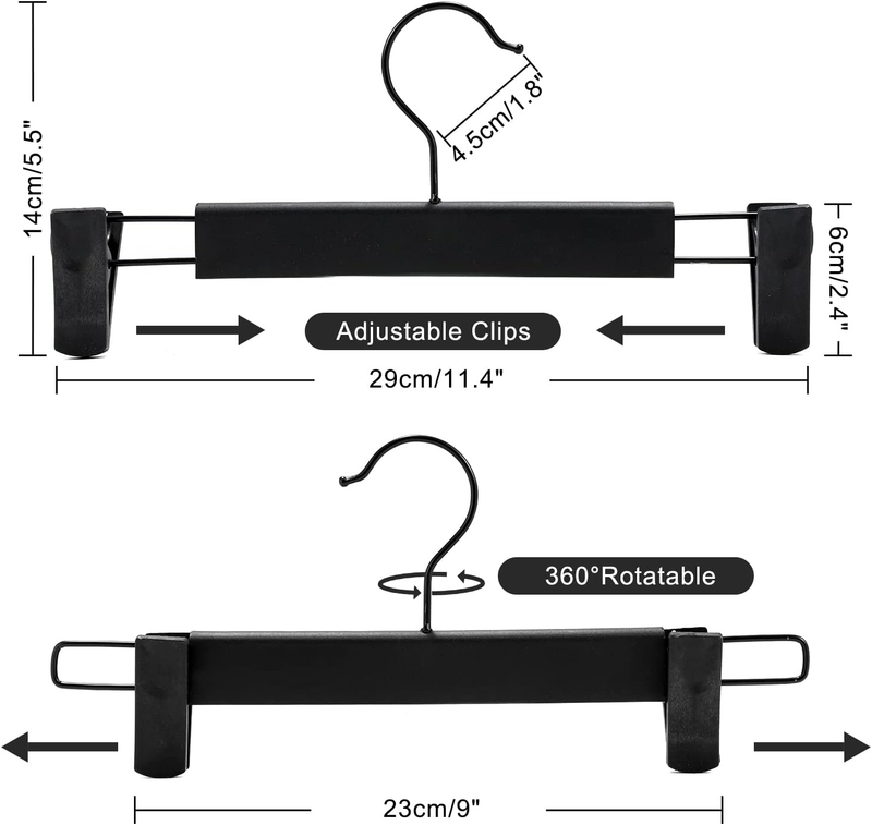 ?Excellent design?: Our trousers hangers are very versatile, the stainless steel hooks can be rotated 360 degrees and can be hung in various positions, the hanger has removable clips at both ends, which can be adjusted from 21 cm to 28 cm, not only suitable for adult clothes, but also For children's clothing, in addition, the clips has a non-slip design, which can firmly hold your clothing and prevent it from falling