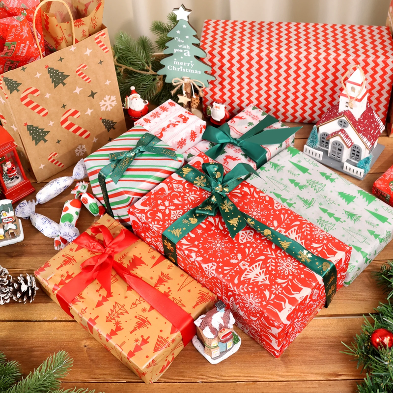 ?FIFTEEN FESTIVE PATTERNS TO CHOOSE FROM: Our christmas tissue paper sheets pack includes 150 sheets featuring 15 unique prints: red/green/white stripes; solid white; solid red; solid green; kraft with white snowflakes; kraft with Christmas tree silhouette; kraft holiday text; white with red/green polka dots; white with blue snowflakes; white with red/green Christmas motifs; white with red Santa icons; red wavy stripes; red holiday collage; white with green Christmas trees?perfect for xmas wrapping paper or layering in tissue paper for gift bags SUPER VALUE PACK FOR PRESENT WRAPPING: Perfect for Christmas Decoration, tissue paper for gift bags, xmas wrapping paper, gift wrap?this 150-sheet set adds festive flair to wrapped boxes and bags, party favors, tree decor, wedding gifts, wine bottle presentations, art craft projects, and more PERFECT 19.6"x19.6" SHEETS FOR EASY USE: Each of the 150 sheets measures 19.6" x19.6", the ideal size for both large presents and small favors Use them as gift wrap or add texture to gift wrapping supplies without trimming or waste SOFT, DURABLE EASY TO FOLD: Crafted from high-quality, tear-resistant tissue paper, these sheets fold smoothly and hold creases without ripping?saving time and ensuring your christmas paper designs stay crisp and elegant THE ULTIMATE SEASONAL ESSENTIAL: From office Secret Santa to family gatherings, this tissue paper for gift bags pack adds polish to every gift and craft. A must-have for your xmas wrapping paper stash and festive decor collection