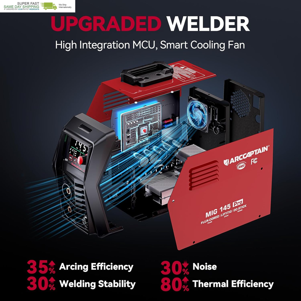 ARCCAPTAIN Icontrol MIG145 Pro 145A Flux Core MIG Welder 120V Welding Machine Gasless MIG Welder Flux MIG/MMA Stick/Lift TIG, 3 in 1 Welder Machine with Synergy, Portable Welder, APP Control