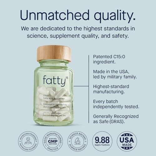 POWERED BY C15:0 (PENTADECANOIC ACID): The first essential fatty acid to be discovered in over 90 years. This award-winning longevity supplement, developed by scientists over 10 years in collaboration with the U.S. Navy, has 3x more cellular benefits than pure omega-3 (EPA). C15:0 strengthens cells by 80%, improves mitochondrial function by 45% and repairs cells to slow aging-related breakdown and protect long-term health. Clinical Study References: Venn-Watson Butterworth PLOS ONE 2022 SUPPORTED GUT AND LIVER HEALTH: The pure C15:0 ingredient in fatty15 has been studied for its potential to support C15:0 levels, gut microbiome balance, and liver function. Research has also explored its role in red blood cell health over 12 weeks. Clinical Study References: Robinson et al. J Nutrition 2024, Chooi et al. Am J Clin Nutrition 2024, Venn-Watson Butterworth PLOS ONE 2022 ALTERNATIVE TO OMEGA 3 FISH OIL, COQ10, UROLITHIN A, AND LIVER SUPPORT SUPPLEMENTS. Unlike COQ10 and urolithin A, which specifically target oxidative stress and mitochondrial function, fatty15 provides an essential nutrient with 36+ cellular benefits and is required by our bodies to uniquely strengthen cells, activate key longevity pathways, and target six hallmarks of cellular aging. Clinical Study References: Venn-Watson Butterworth PLOS ONE 2022, Venn-Watson et al. Scientific Reports 2020 MULTIPLE LONGEVITY-ENHANCING ACTIVITIES, including its role as an essential cell-strengthening and antioxidant supplement, providing whole-body support, including liver health. Unlike omega-3s, which are prone to lipid peroxidation and can weaken cell membranes, fatty15 resists oxidation and strengthens cells. Supports long-term health at its core, including its role as a fatty liver supplement. Clinical Studies: Venn-Watson Schork Nutrients 2023, Venn-Watson et al. Scientific Reports 2020 AWARD-WINNING LONGEVITY SUPPLEMENT: The groundbreaking discovery of C15:0 as an essential fatty acid, followed by the development of fatty15?s pure, optimized, and patented C15:0 longevity-supporting ingredient, were led by the doctors and scientists of fatty15. Clinical Study References: Venn-Watson Schork Nutrients 2023, Venn-Watson et al. Scientific Reports 2020