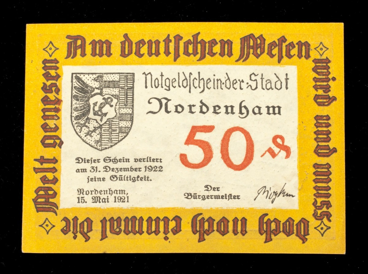 1918 Nordenham Germany 50 Pfennig, Extra Fine (XF), Grabowski/Mehl:982.2a-1/2 (90x68), Private Printers [PP] Visit Our Store: Continental Coin and Jewelry