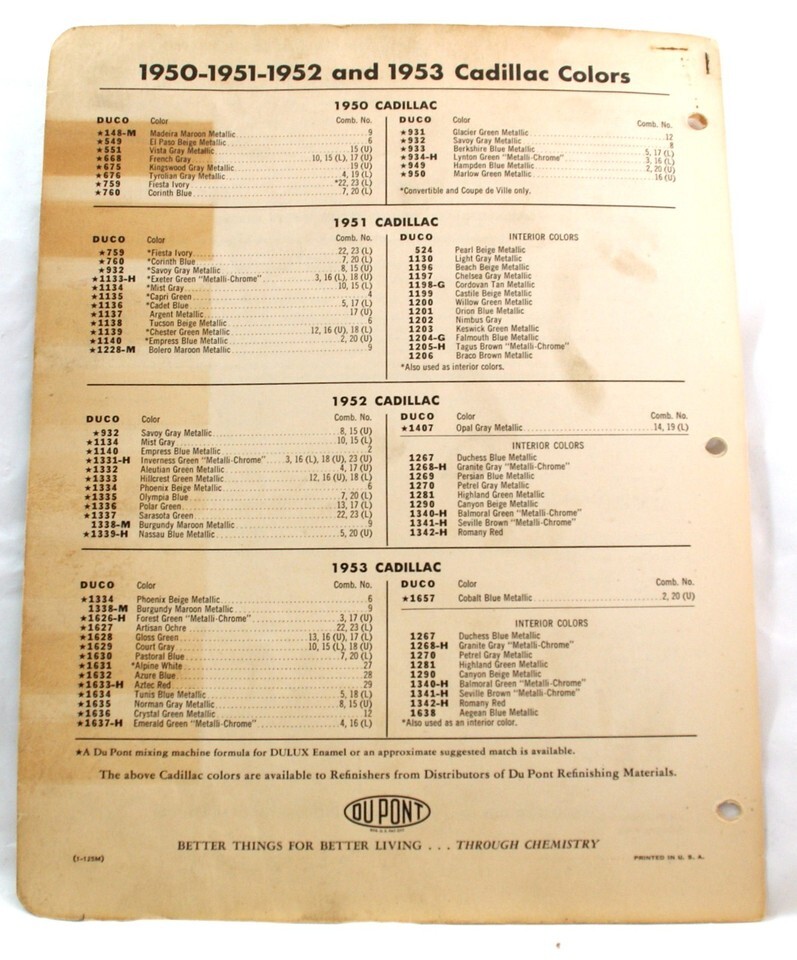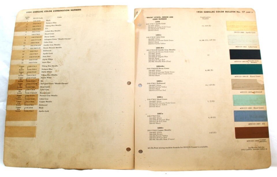 627 1954 Cadillac DuPont Paint Chip Color Bulletin 3 Page Set #627 Used Manufacturer: DuPont Paint Condition: Good/Fair (SEE PHOTOS with minor wear and soiling the information is still available to see) Part Number: Bulletin 17 1954 Cadillac Exterior color chips. / 1954 Cadillac color Combination Numbers Also includes: - 1950 - 1951 - 1952 - 1953 non-chipped colors 1957 Chevrolet Interior Colors Pages: 3 Details: W 8.5 x H 11 x D 0.1
