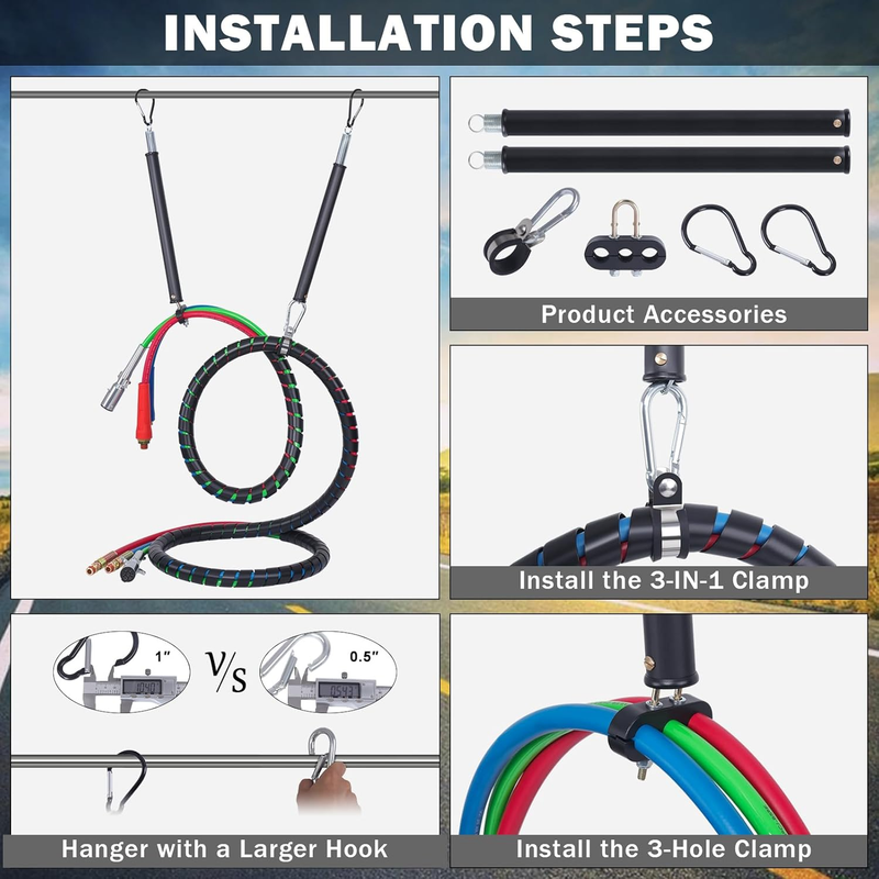 The CheeMuii Single Tender Spring Kits are designed to organize and protect air hoses and power cords on trucks, semi trucks, trailers, and tractors.