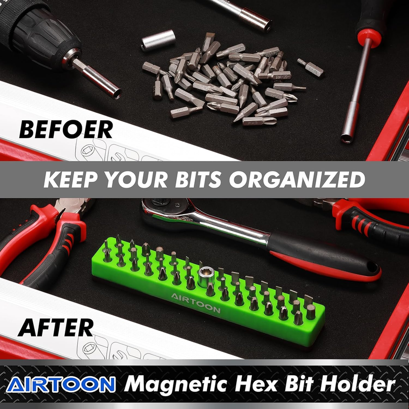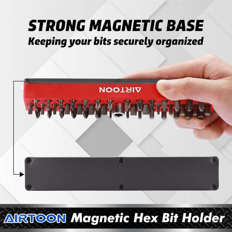 The Airtoon 1/4" magnetic hex bit holder made of high quality, heavy duty, and impact resistant polypropylene material, it can be used for a long time. The magnetic base is strong enough to hold the bits without them falling out in a tool box . It is strong enough to hold bits even when it's upside down but easy to remove from it.