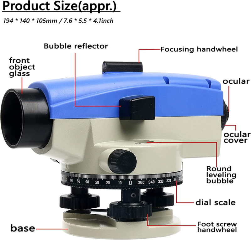 This surveyors level is designed with a 5/8? X11 thread for standard tripod and a circular bubble vial for easy set-up and alignment. A thick plastic case is provided for you to carry around and store easily.