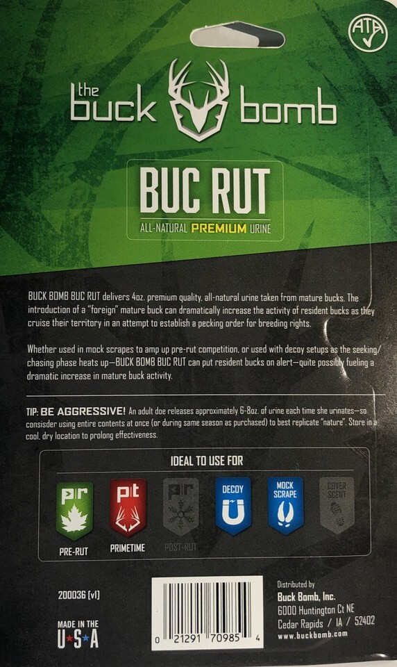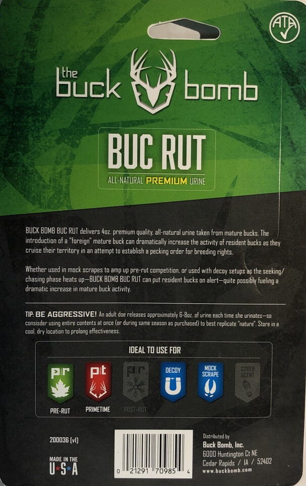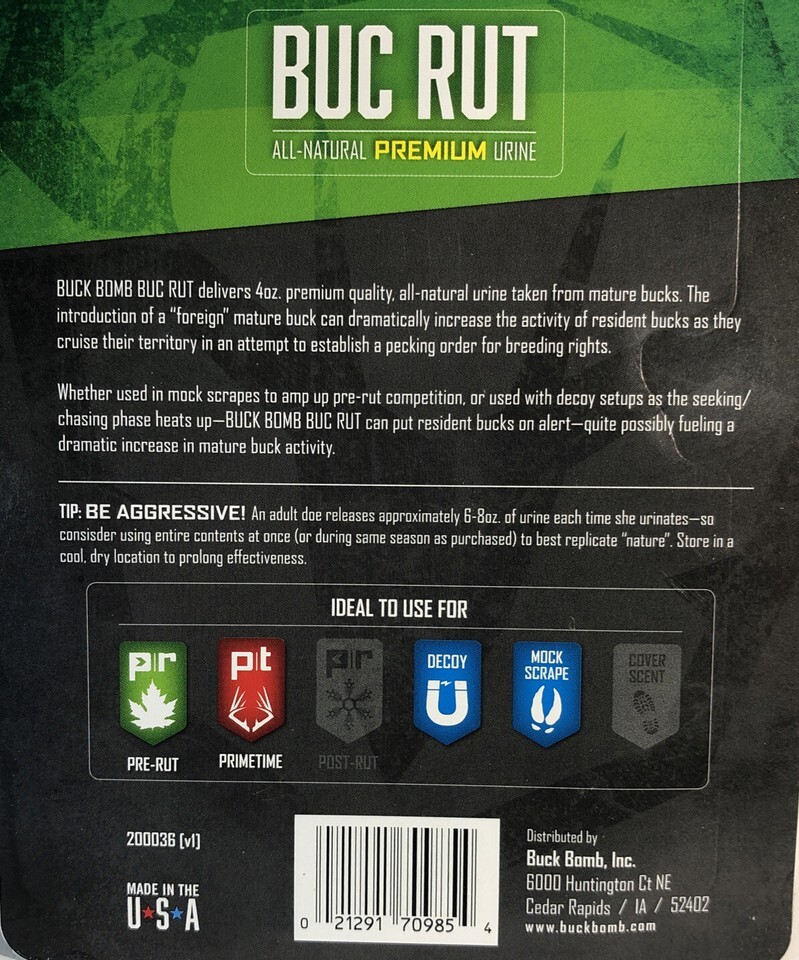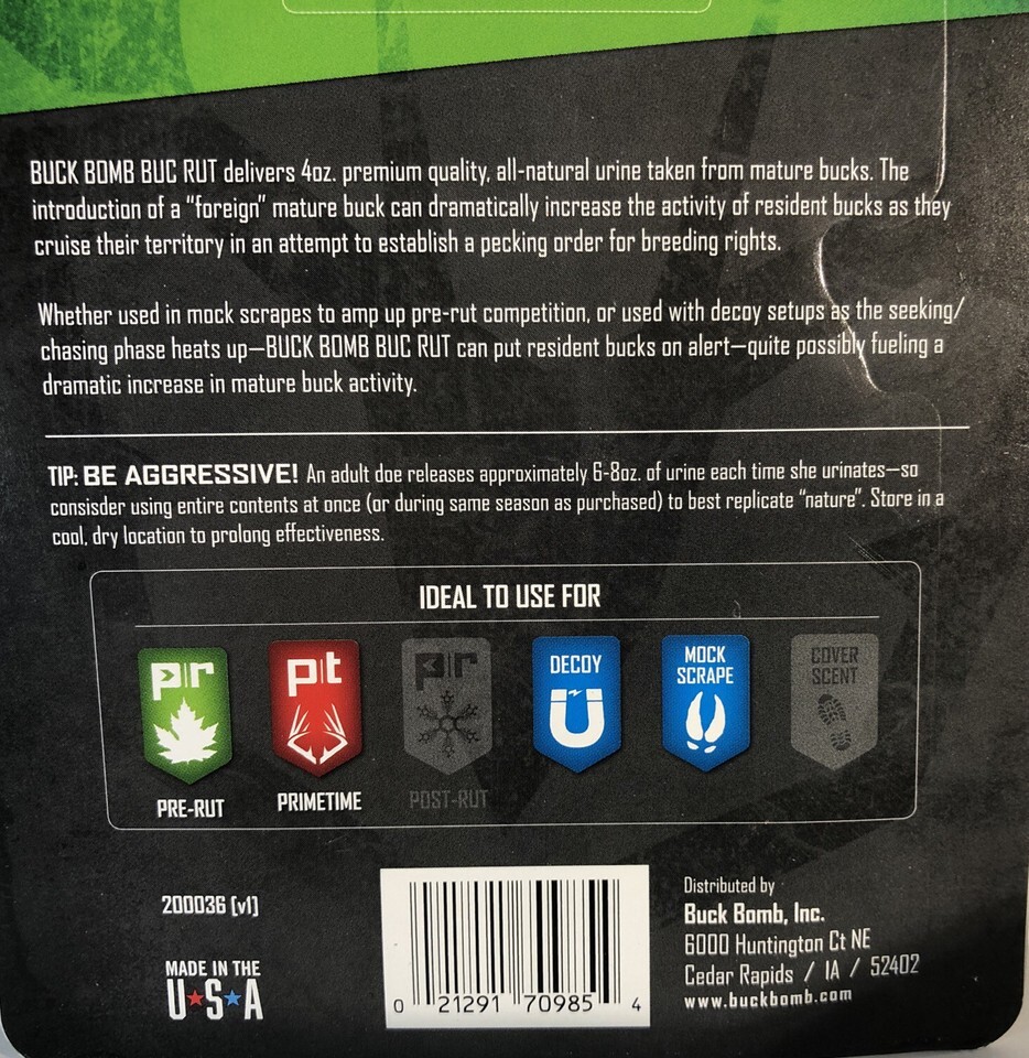 Buck Bomb BucRut contains pure, fresh urine collected from bucks that are at least 3. 5 years old.