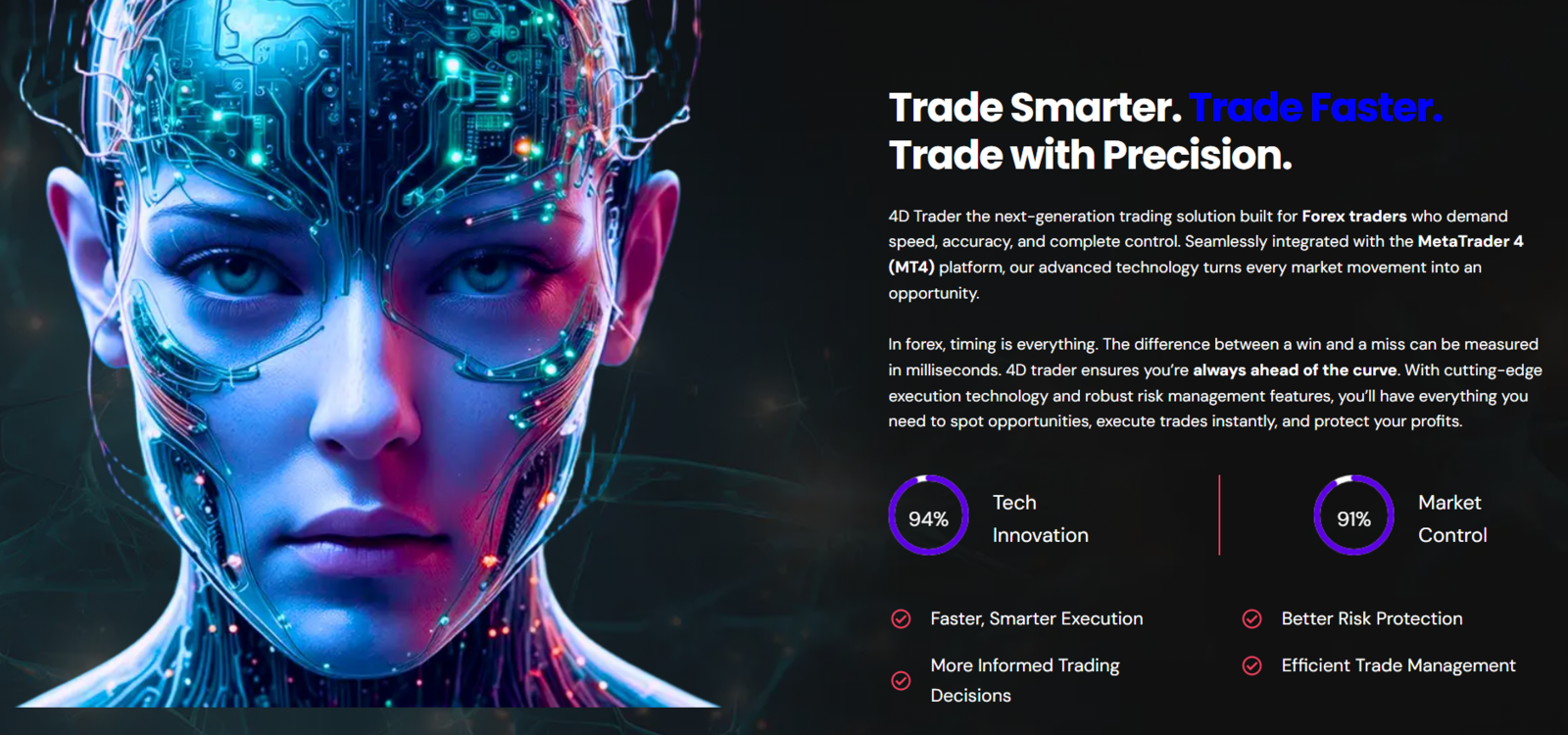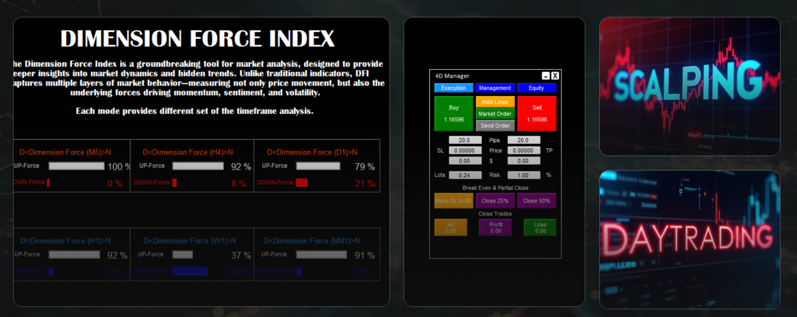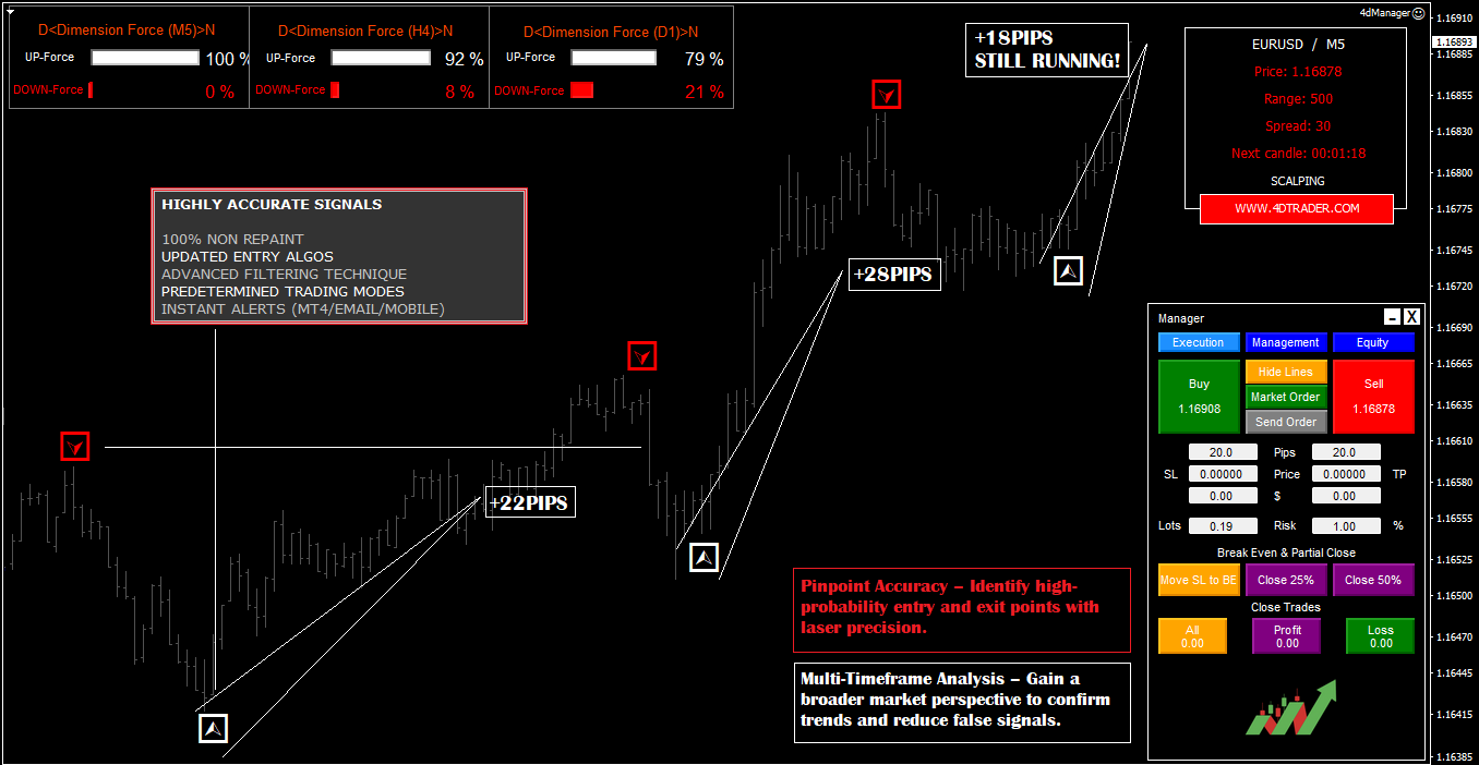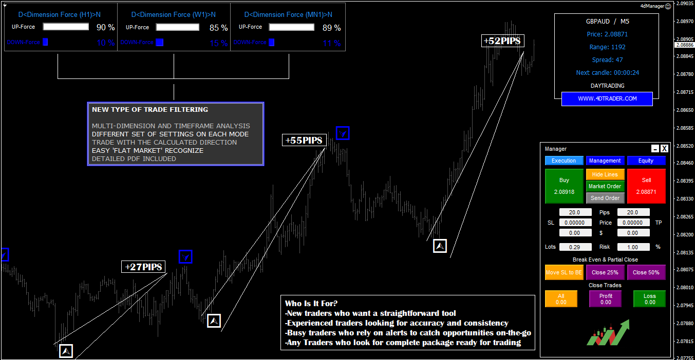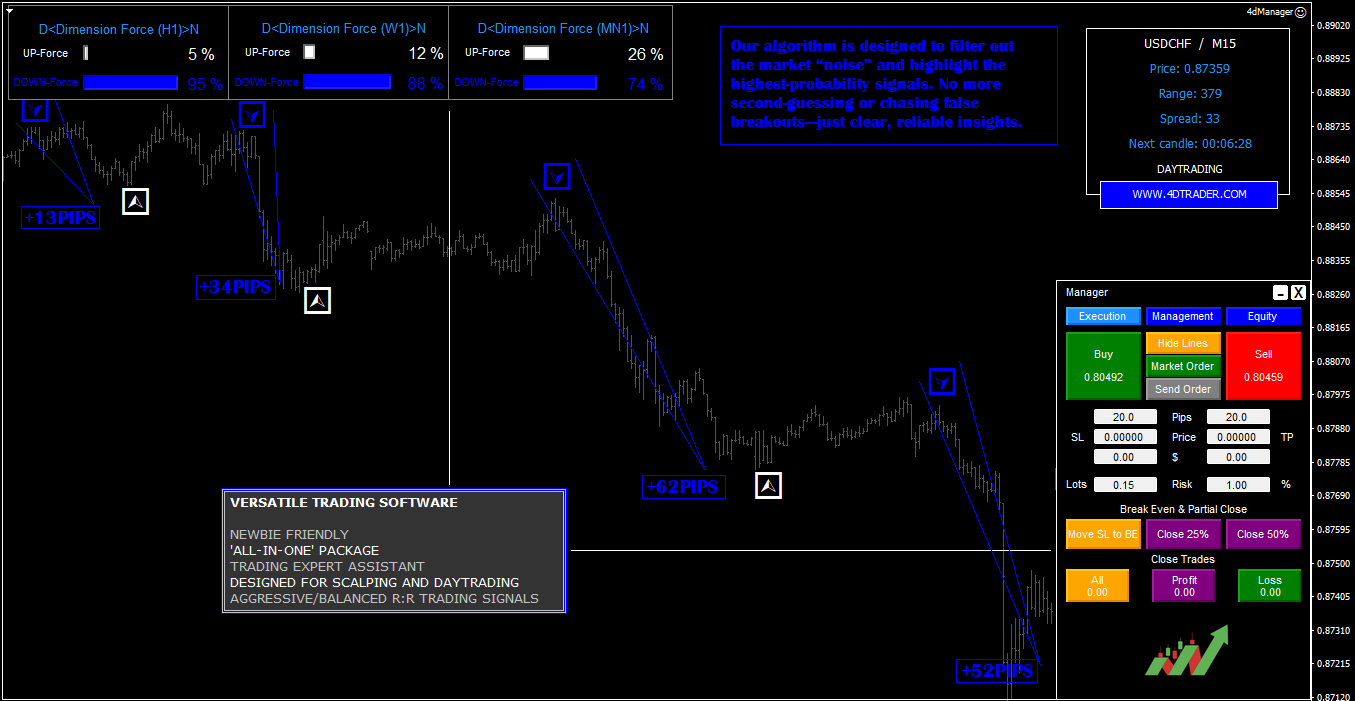 Upgrade your Forex CFD trading experience with 4D Trader, a decision?support system built for MetaTrader?4. Tailored for serious traders, it merges algorithmic precision, multi?timeframe analysis, smart alerts, and ultra?fast execution. Here’s what 4D Trader gives you: