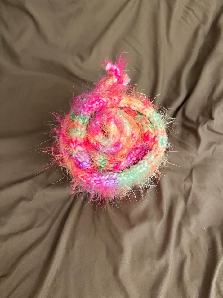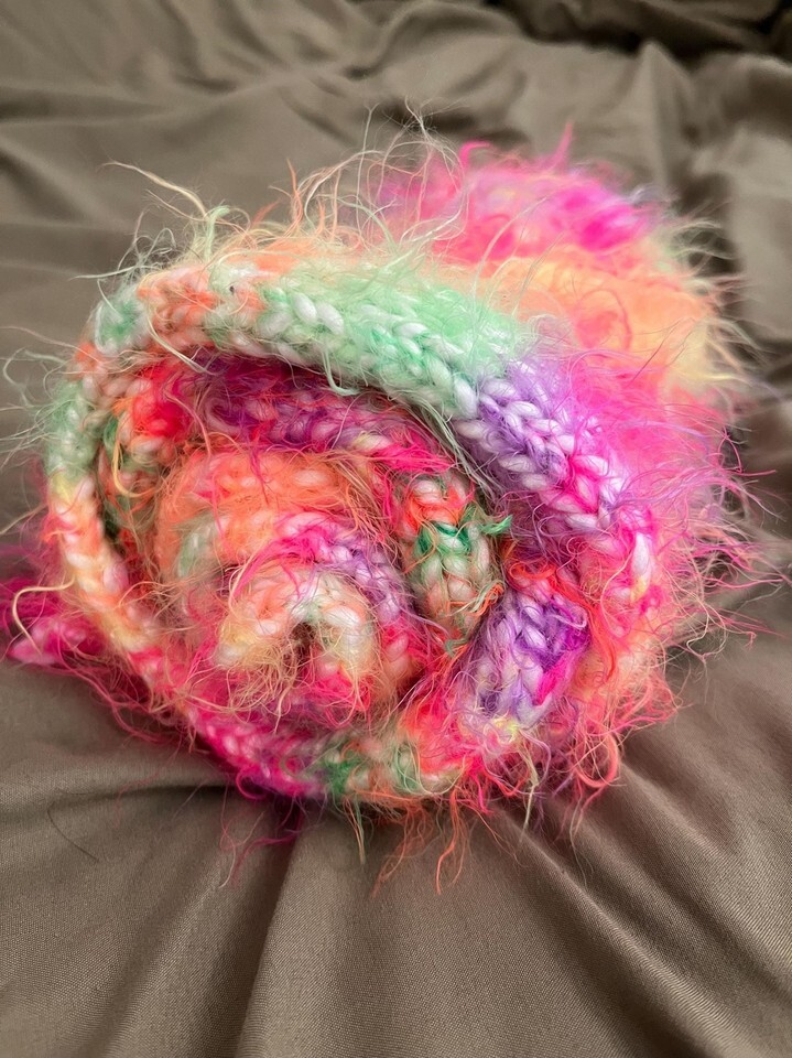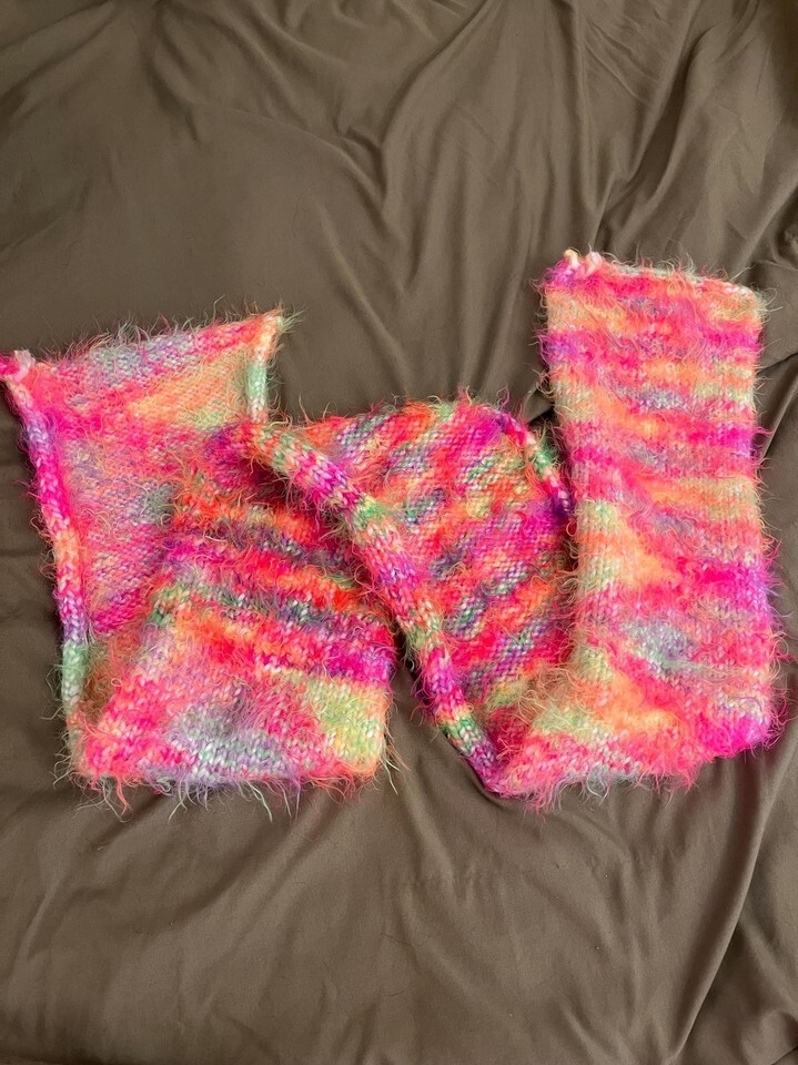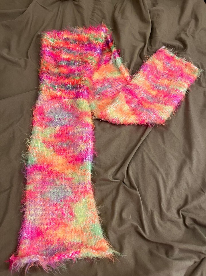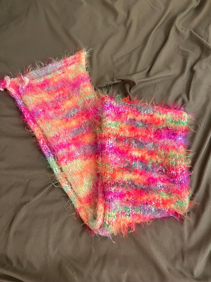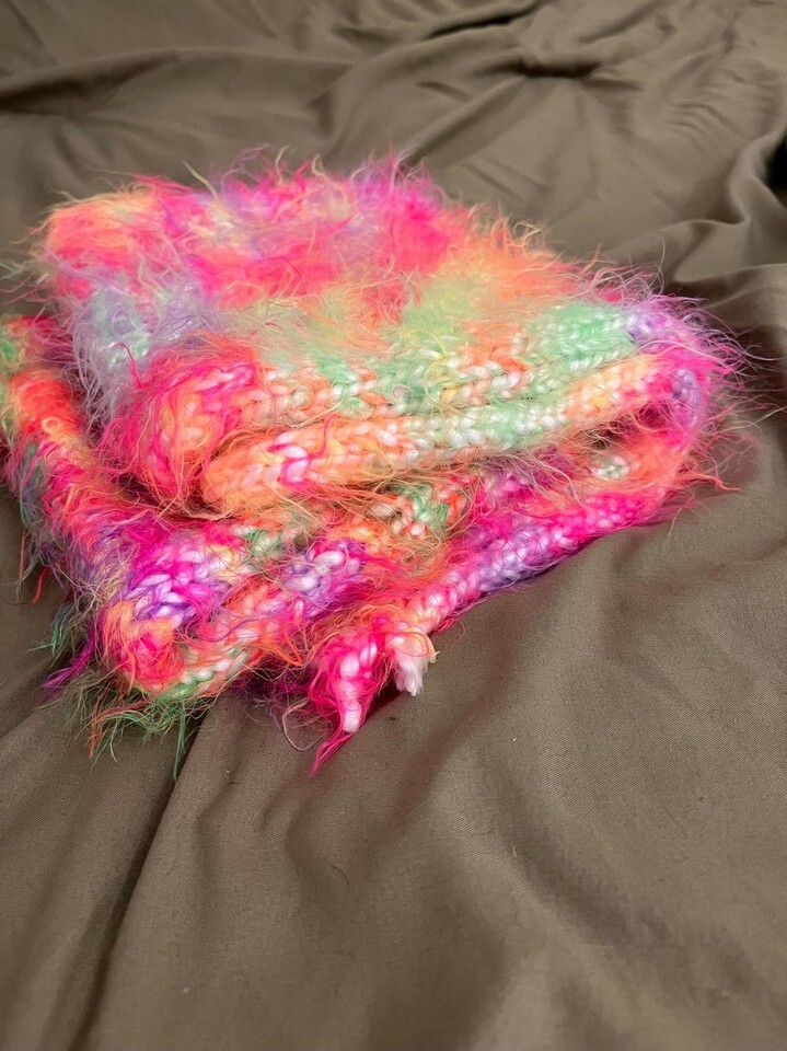 - Fuzzy Handknit Rainbow Mottled Scarf