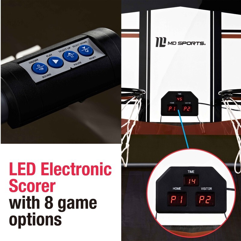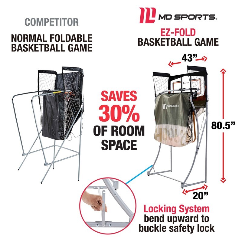 Compact Storage: Unique EZ-FOLD design allows for easy and compact storage, saving 30% more space than similar basketball games Multiple Games: Features 8 different games for two-player action, providing a variety of playing options LED Scoring: Equipped with an LED electronic scorer that tracks your best scores and includes authentic sound effects Complete Set: Includes 4 basketballs and an air pump, ensuring you have everything needed to start playing Authentic Backboard: Clear polycarbonate backboard offers an authentic playing experience Durable Frame: Constructed with a 1-1/8? diameter steel tube frame and two reinforced 12-inch steel rims for stability and durability Product Dimensions: Measures 81 inches x 43 inches x 80.5 inches (LWH) when set up, and 43 inches x 20 inches x 80.5 inches (LWH) when folded Packaging Dimensions: 46.25? x 22.75? x 5.25? (LWH) Packaging Weight: 40 lbs Brand: MD Sports