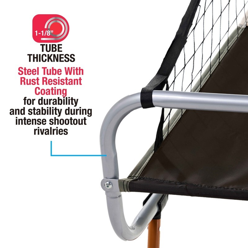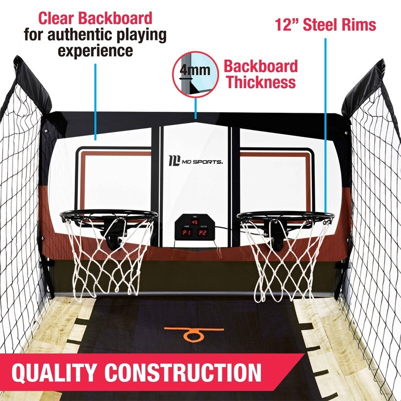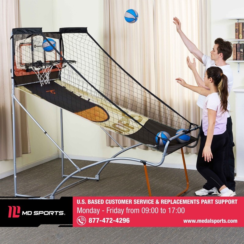 The MD Sports EZ-Fold 2 Player Arcade Basketball Game with Authentic Shatterproof Backboard features 8 different games for one or two-player action. The unique EZ-FOLD design provides for compact storage, folded dimensions are 43 inch x 20 inch x 80.5 inch. This indoor basketball game features an LED electronic scoring system, realistic arcade sound effects, and a clear polycarbonate backboard for a true pro-style playing experience. Built to last, it?s constructed with a sturdy 1-1/8? diameter steel tube frame and two reinforced 12-inch steel rims, providing excellent stability and durability during active play. Pop your best shot every time with this arcade-style dual basketball game that includes 4 basketballs and an air pump.