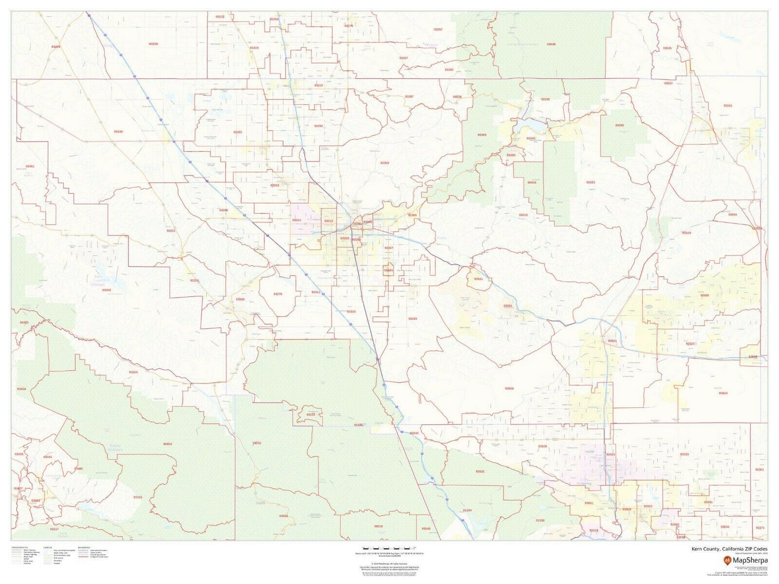 This map of Kern County, California shows ZIP code areas overlaid on a road map. Ideal for planning of deliveries, home ervices, sales territories, real estate and much more. Base map features include all roads with major roads and highways labelled; neighborhood names; railways; and high level land use such as parks and recreation areas, industrial areas and hospital campuses.