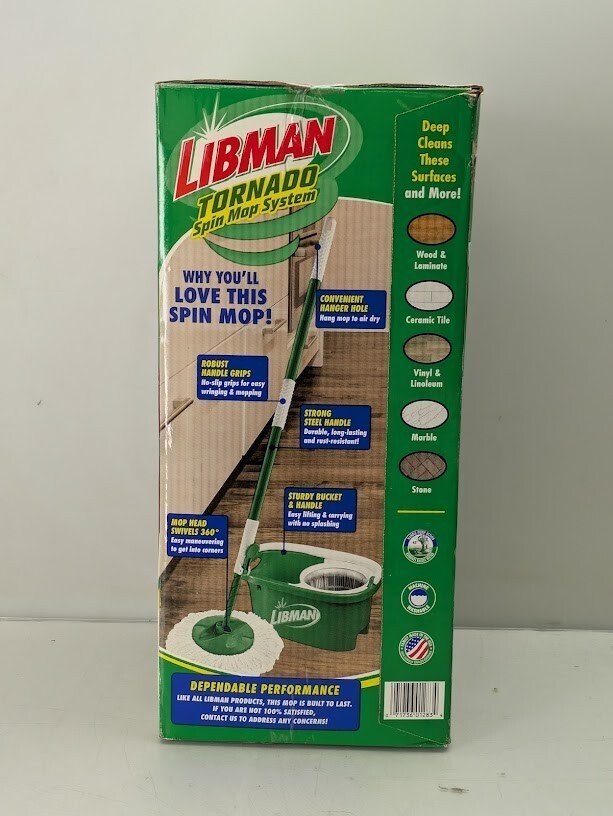 The Libman Tornado Spin Mop with Bucket Cleaning System is a convenient all-in-one spinning mop system. It is designed with a large, microfiber, machine-washable Libman mop head that absorbs and removes more water so your floors dry quickly. The micro fiber mop is tough enough for dirt and grime but soft enough that it won't scratch floors and can be used on any hard floor surface. The heavy-duty Libman spin mop bucket and mop spinner chamber work to remove water and dirt efficiently from the mop head. The bucket is also designed to prevent tipping while carrying and has a convenient pour spout for emptying. This Libman mop has a lower handle that is precision-molded and impact-resistant to last through all your toughest mopping jobs. You can unlock and push the handle down once for a damp mop or more times for a drier mop. Serves as a great microfiber mop for hardwood floors. The mop with bucket has a 360 swivel head that makes it easy to maneuver the mop head around your floors, walls, and even for cleaning the outside of your car.