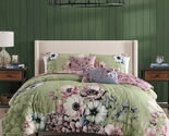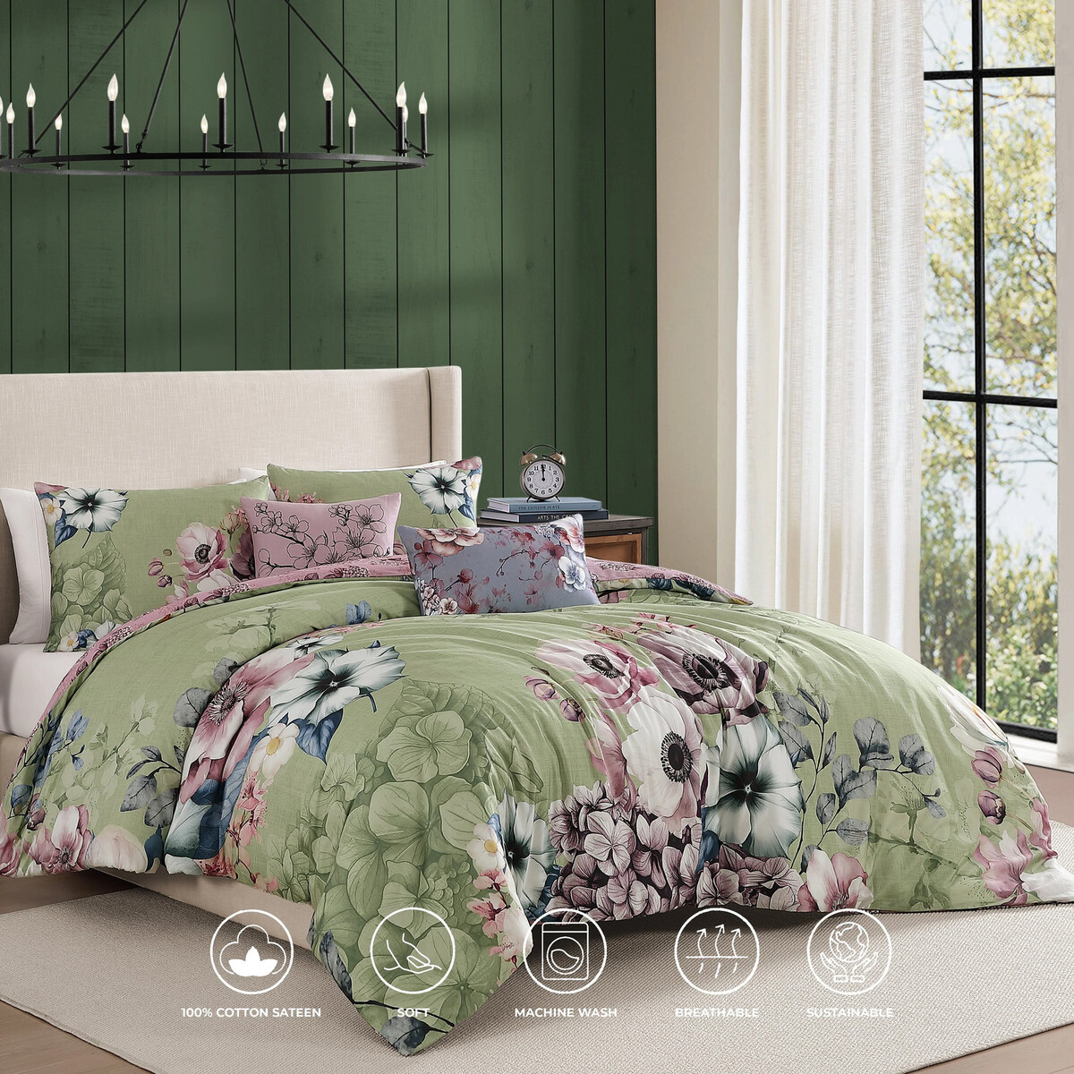 The design showcases a stunning array of flowers in lilac, mauve and slate blue on a green tonal background, bringing soft, nature-inspired color to your bedroom. For added versatility, the reverse features a mauve small floral print that offers a secondary look without changing your duvet cover.