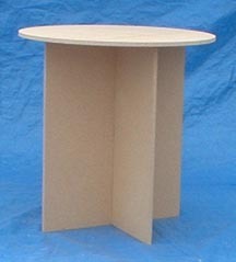 These custom display tables are made out of sturdy 5/8" particle board for a smooth finish but with no splinters- and they are very heavy: assembled tables weigh from about 30-50 pounds depending on size. These tables are designed to be draped with fabric. Round glass tops are optional(custom sizes are available at glass dealers). Particle board can be painted but the finish doesn't turn out as good as painting hardwood. Drape tables are shipped in 3 parts to assemble with no mechanical attachments: 2 slotted legs slide together to make the base, and then the top sets on the base secured by an "X" underneath that channels the legs.