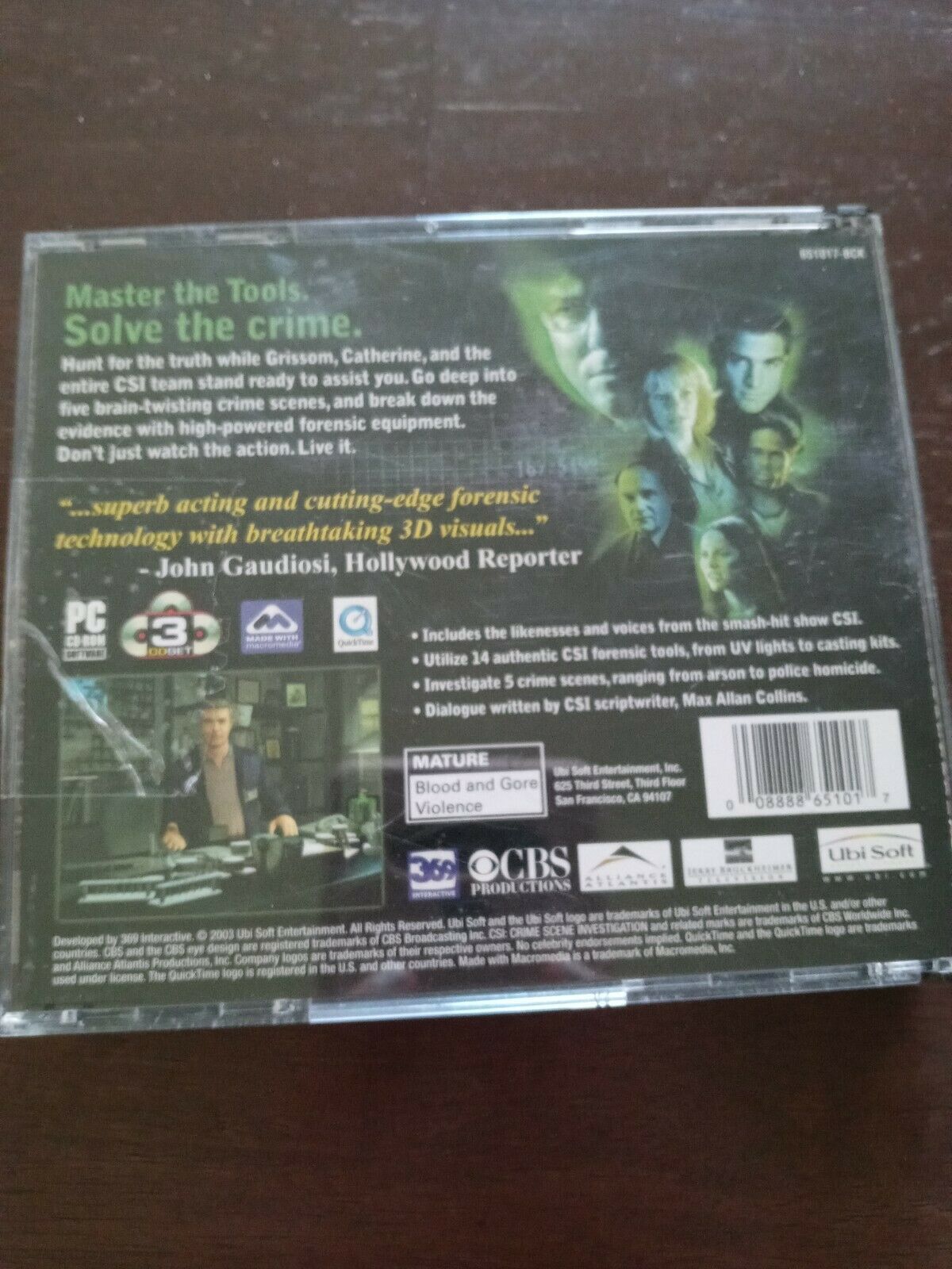 PC CD-ROM Software 3 CD - CSI: Interactive Crime-Solving Adventure 2003 Ubi-Soft. Condition is "Very Good". Shipped with USPS Media Mail.Very Good Condition ; Condition is Used-See Pictures Attached For Exact Condition . Shipped with USPS First Class Mail . You Will Receive 1 ea PC CD ROM as shown in pictures attached. SHIPS N 24 HOURS Packed By Our Award Winning Packaging And Shipping Department Long Time E-commerce Seller For Over 20 Years LIMITED AVAILABILITY THANK YOU FOR SUPPORTING OUR FAMILY OWNED USA BUSINESS Collectible Very Good Condition PC CD ROM (Has Wear See Pictures Attached For Exact Description) - CD's Are Tested And Cleaned With Our Professional CD Cleaning Equipment Before Shipped - Ships Immediately - Great Product at a Unbelievable Price - Your Chance To Own This Collectible PC CD ROM Before Its Gone. Inventory Box #6216