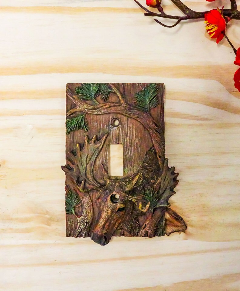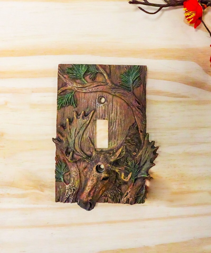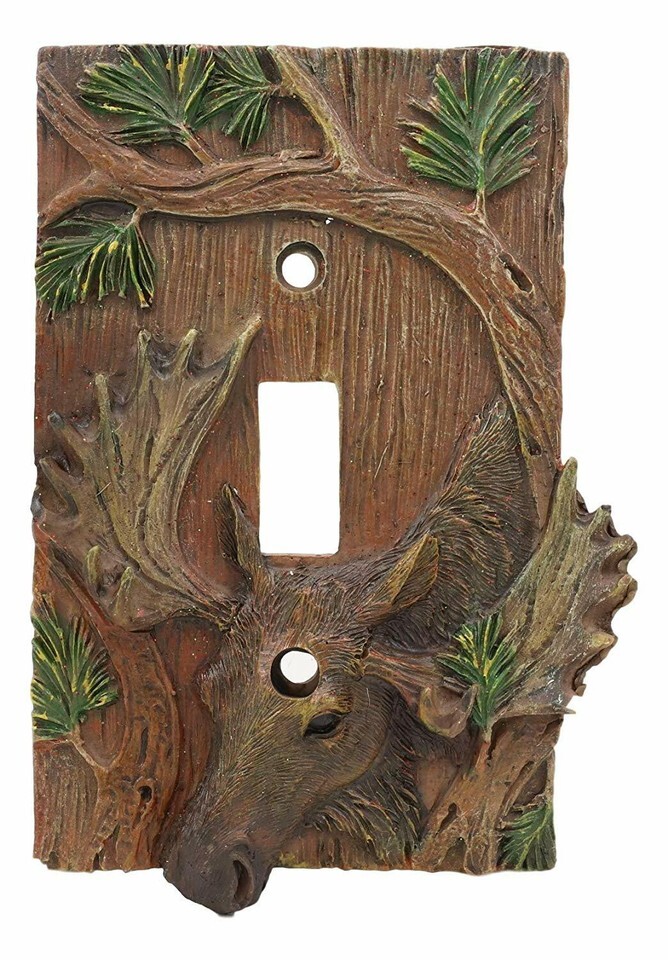 ? It is now very easy to transform your space at your home or office into a rustic Western exotic getaway with these stag moose electrical cover plates. A moose peeks through pine boughs on this richly detailed polyresin switch cover.