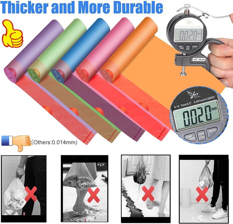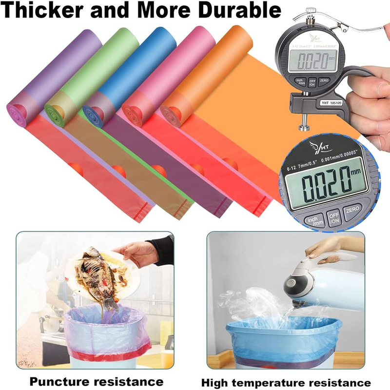 TYBONDER 4-6 gallon trash bags are designed with 0.9mil thick(30% thicker than most brands), These trash bags are stronger and thicker than other normal trash bags, Maximum strength holing up 9kg trash. These small trash bags 4+ gallon are anti-puncture, tear-proof, good toughness and leakproof.