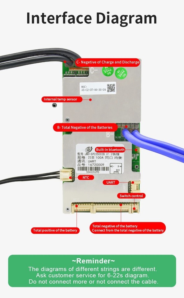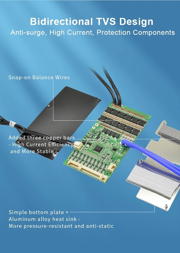 This BMS supports 6S 7S 8S 9S 10S 11S 12S 13S 14S 15S 16S 17S 18S 19S 20S 21S batteries, buying a BMS is equivalent to having 14 BMSs, 3 NTCs, built-in Bluetooth, suitable for electric motorcycles, tricycles, small four-wheelers car.