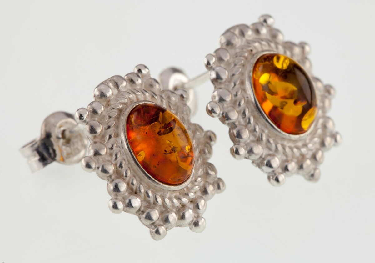 Sterling Silver Amber Cabochon Stud Earrings with Butterfly Backs