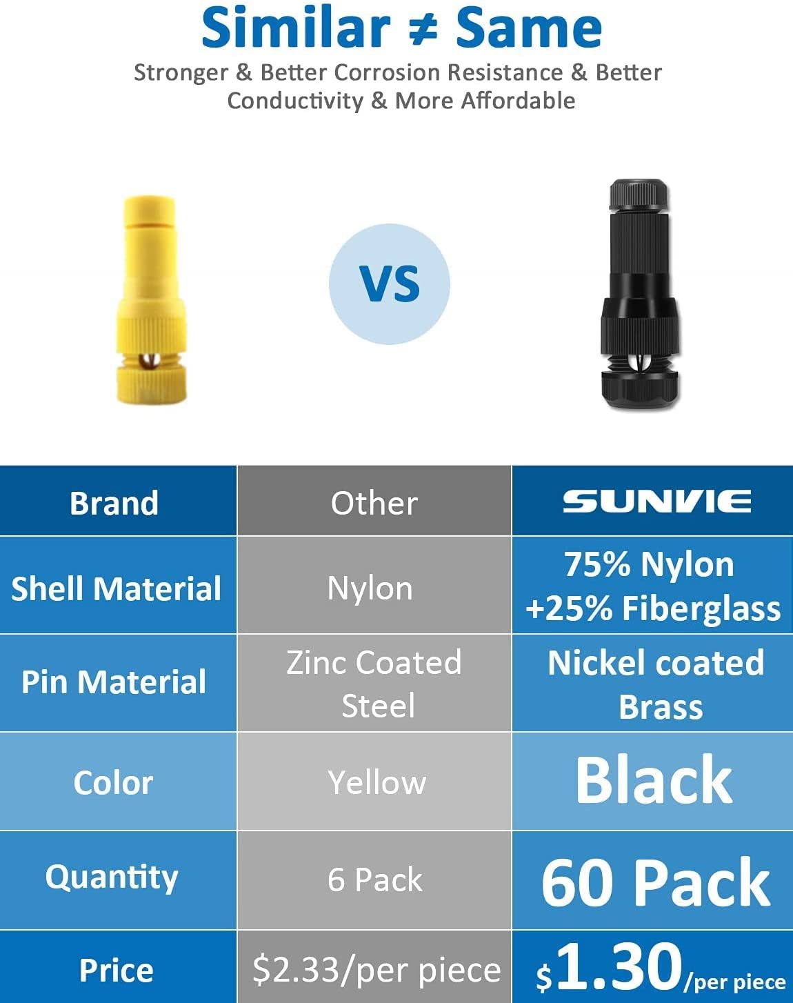 Ultra Strong Nylon Plastic and Brass Pin:SUNVIE landscape lighting connectors are made of extremely sturdy nylon plastic + fiberglass mixture and CNC machined nickel- plated brass pins to ensure corrosion resistance and electrial conductivity for outdoor use.
