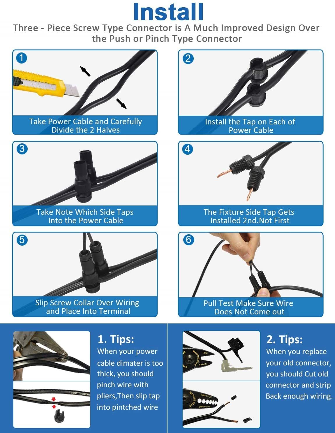 Super Easy to Install: No crimping, No cutting, No splicing. Great improved design and high quality machining ensures reliable connections for years.Only take 3 minutes to connector your landscape lights easily and quickly.