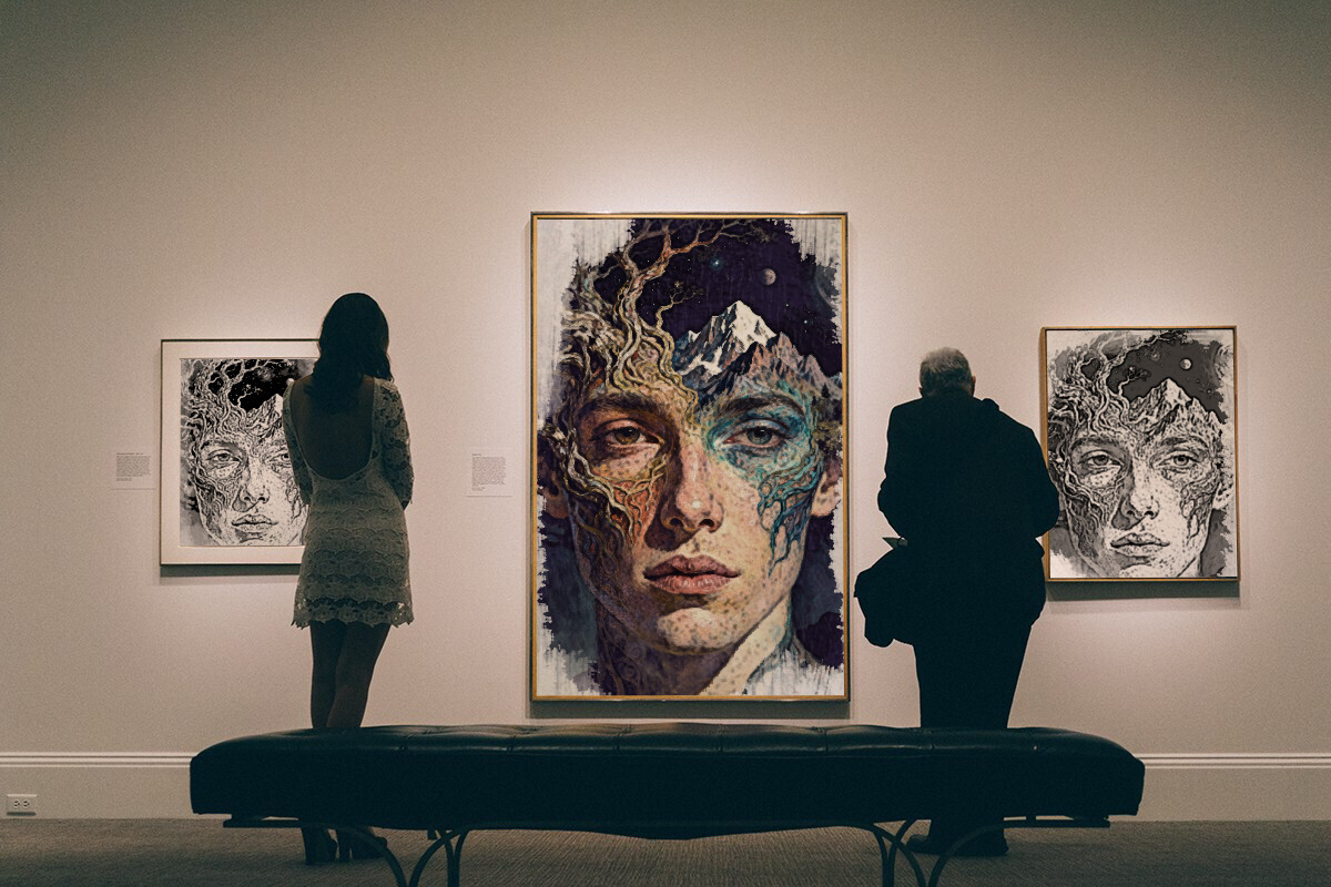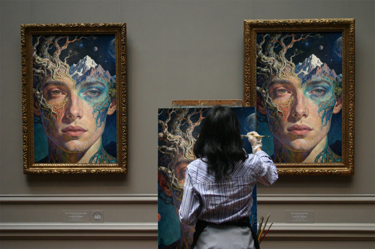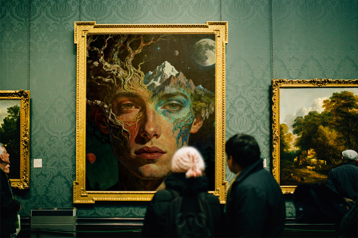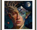Fine details in the facial features, mountains, roots, and branches give the artwork a high-end, gallery-worthy appearance.