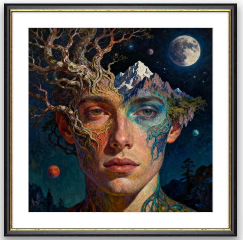 A mesmerizing digital artwork that merges a human face with twisting tree roots, towering mountains, and a cosmic night sky filled with the moon and distant planets. This piece captures the inner journey of the human soul between earth and sky, roots and peaks, reality and dreams.