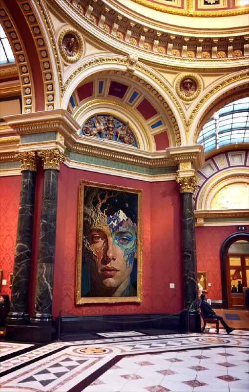 Rich, harmonious colors blend warm and cool tones to create depth and a dreamlike, surreal feeling.
