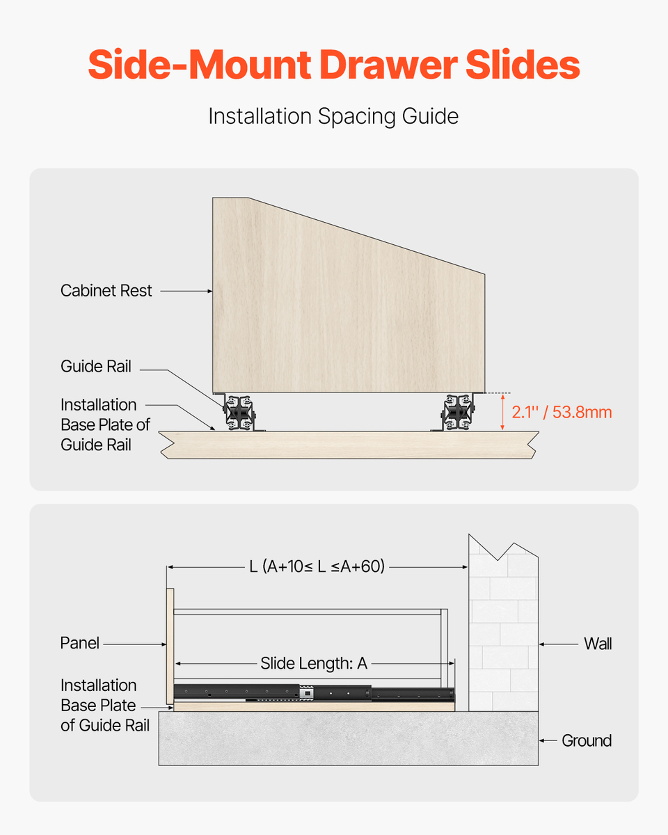 Installation Guide: Before installation, please reserve enough height between the side cabinet bottom and the drawer to ensure smooth installation of the ladder cabinet slide rails. Also, ensure that the selected slide rail length is less than or equal to the cabinet body length