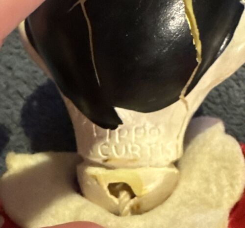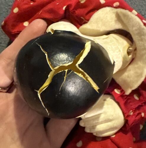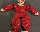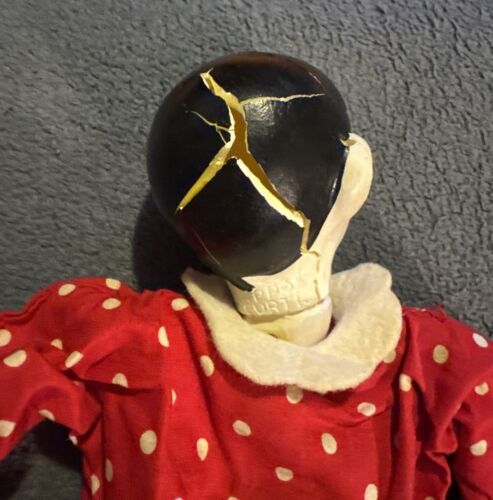 See ALL photos. Item is damaged on the back of the head. The head I think is made of wood and is cracked. Could possibly be repaired. See all photos prior to purchase. Sold as is. Approx 14 inches. Has holes for puppet strings. Item pictured is item you will receive.